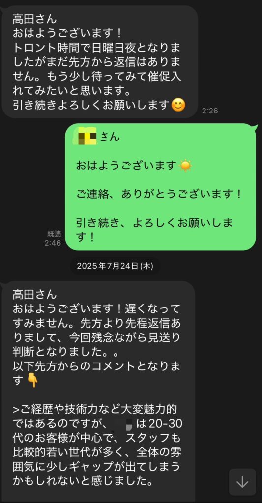 エージェントさんも、まさかの2連続不採用という結果に気を遣ってくださり、非常に心強かったです。
